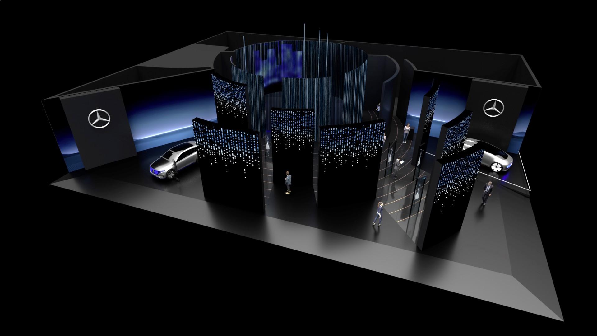 O espaço da Mercedes-Benz convida os visitantes a um mundo de mobilidade direcionada para o futuro, onde podem experimentar os destaques da marca EQ - o EQC 400 4MATIC totalmente elétrico (consumo combinado de energia: 20,8-19,7 kWh / 100 km; emissões combinadas de CO2: 0 g / km), o Vision EQS e também o novo veículo futurista.