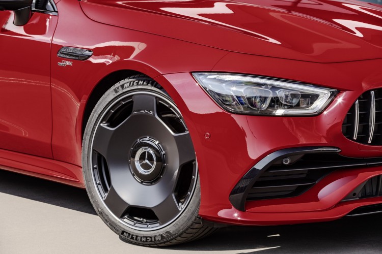 As versões AMG GT 53 e GT 63 do AMG GT Coupé de 4 portas estão equipadas no eixo dianteiro com jantes de 10 raios de dimensões 9.5 J x 19 H2 ET 22, pintadas em prata vanádio, com pneus 255/45 R 19, enquanto no eixo traseiro estão instaladas jantes de dimensões 11.0 J x 19 H2 ET 17 com pneus 285/40 R 19.
