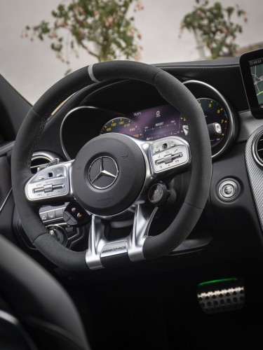 O design extremamente desportivo, as zonas de apoio das mãos com contornos pronunciados e uma utilização intuitiva são os atributos principais do novo volante AMG revestido em pele, de série. A secção inferior é achatada e as zonas de apoio das mãos são perfuradas. As patilhas de mudanças no volante com revestimento galvanizado permitem um estilo de condução ainda mais desportivo com o comando manual da caixa de velocidades. No C 63 S, o volante inclui de série um aro revestido em pele / microfibra DINAMICA (opcional para o C 63). O volante AMG está disponível como opção em pele com aplicações de revestimento lacado preto, e também microfibra DINAMICA com aplicações de revestimento em fibra de carbono.