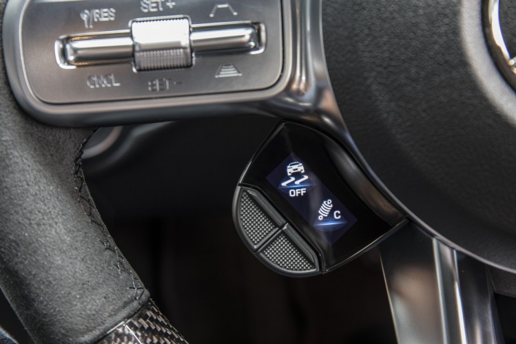 Como opção, o volante desportivo pode ser equipado com inovadoras características adicionais. Estas consistem num controlador circular com um ecrã integral abaixo do raio direito do volante, e dois botões de ecrã a cores posicionados verticalmente abaixo do raio esquerdo do volante. Os programas da transmissão AMG podem ser ativados diretamente através do controlador. O programa da transmissão selecionado é indicado no ecrã LCD a cores diretamente integrado no controlador.